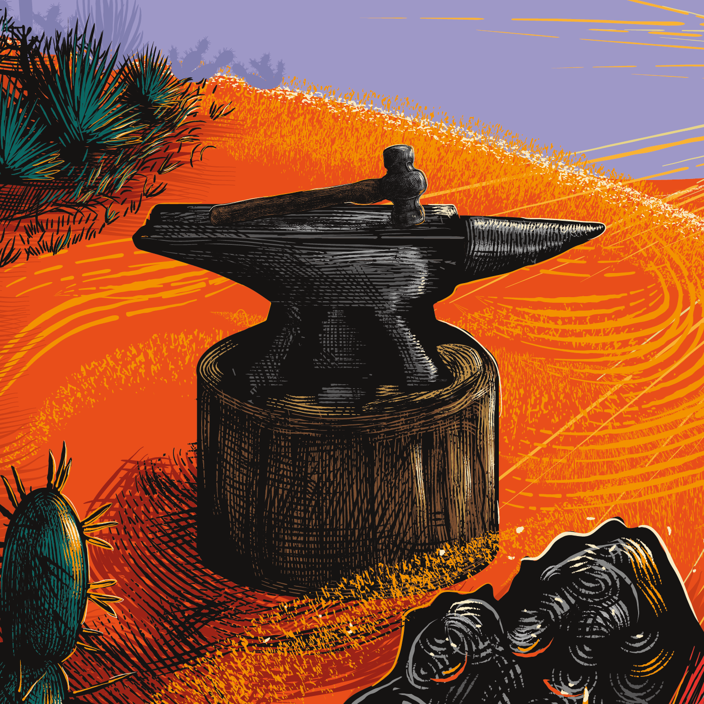 The damasc pattern/layers started to be seen on the blade, which is glows from the fire that burns from under the furnce. On the background the landscape is the Arizona's wild desert, an anvil with a blacksmith's hammer stands on a trunk.