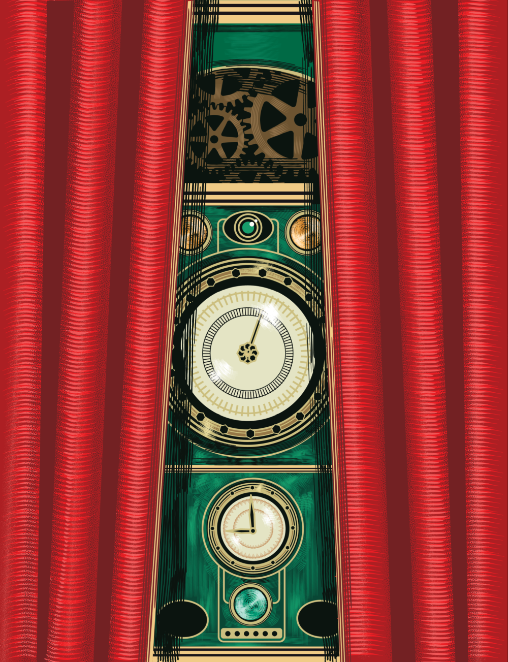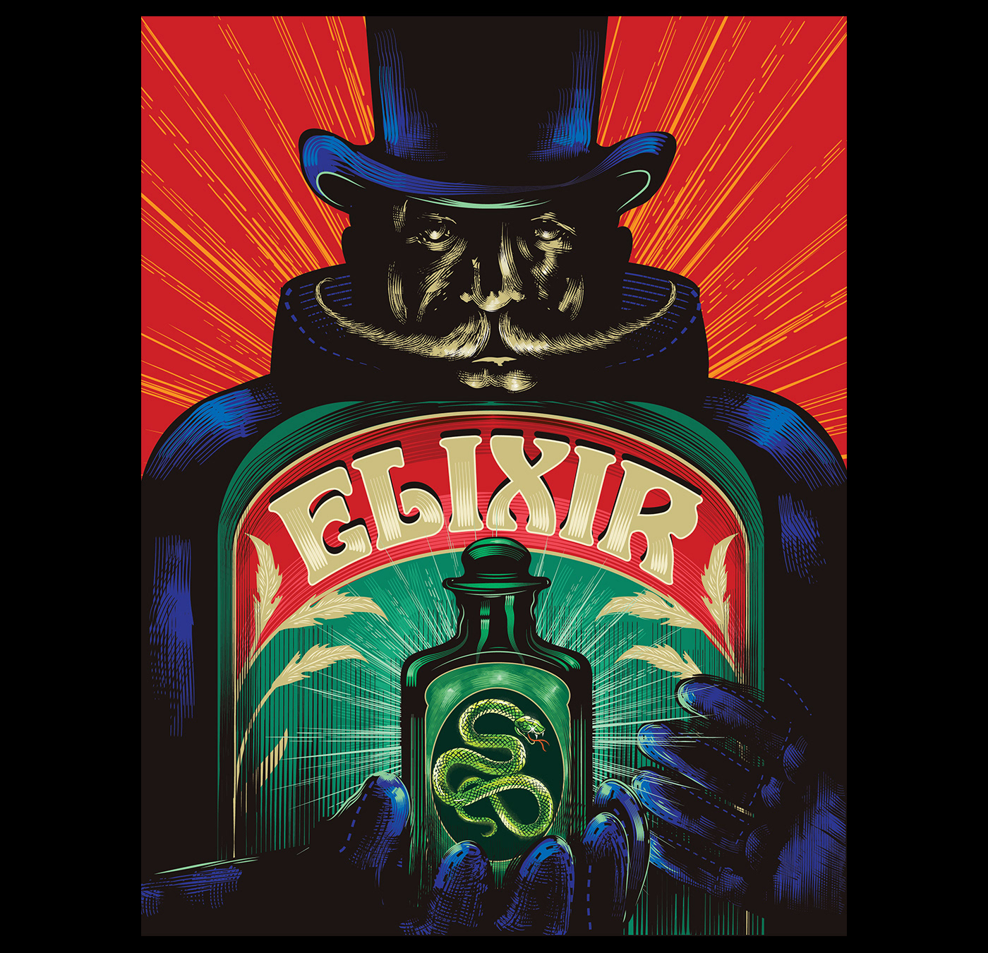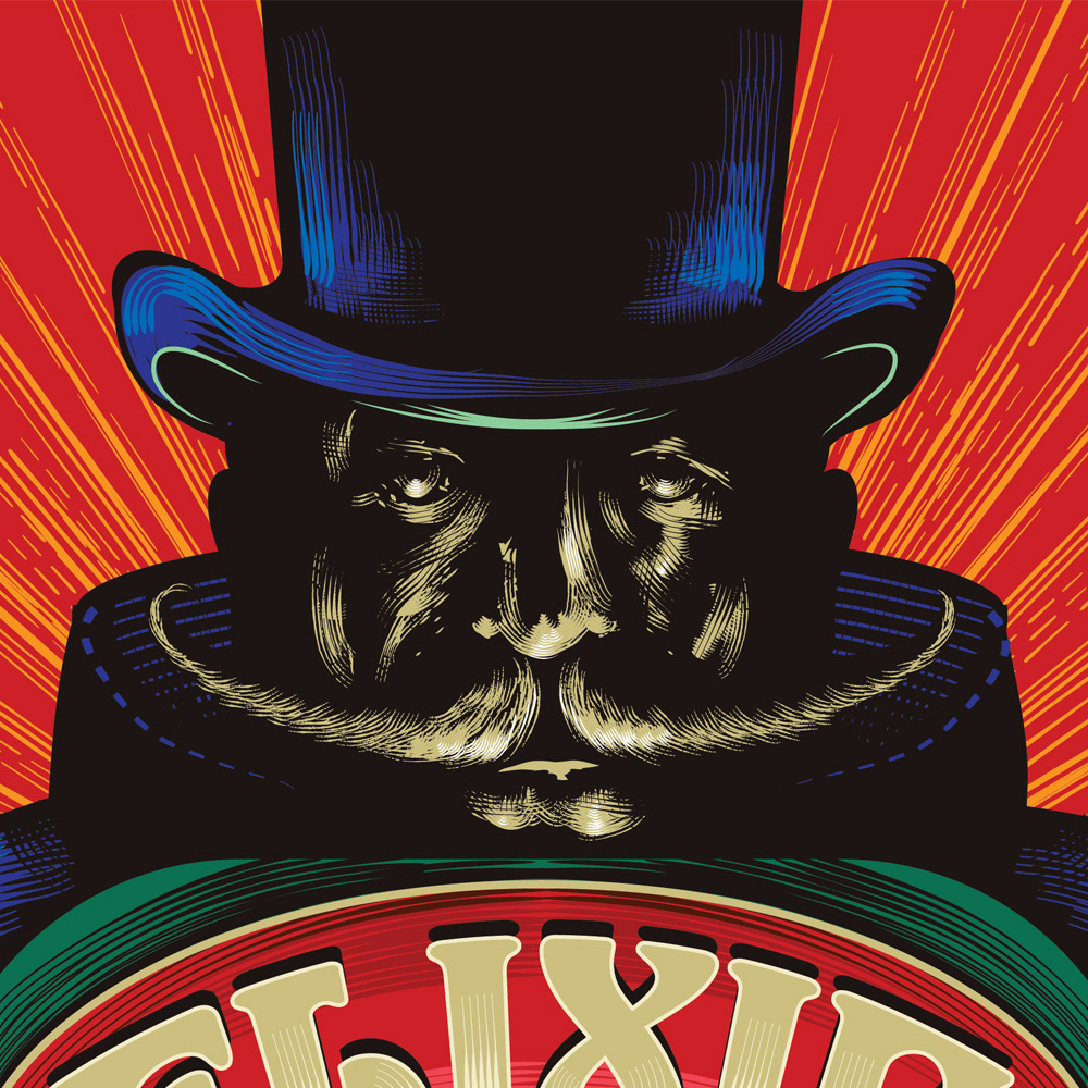 The style reflects the vintage circuses, the late 1800's & early 1900's snake oil ads with a hint of Steampunk at the same time needed to draw some inspiration from the Wizard of Oz with a lot of detail. Like the Flying house, Cowardly Lion, Scarecrow, Witch of the East, Tin Man, The Wizard's machine.