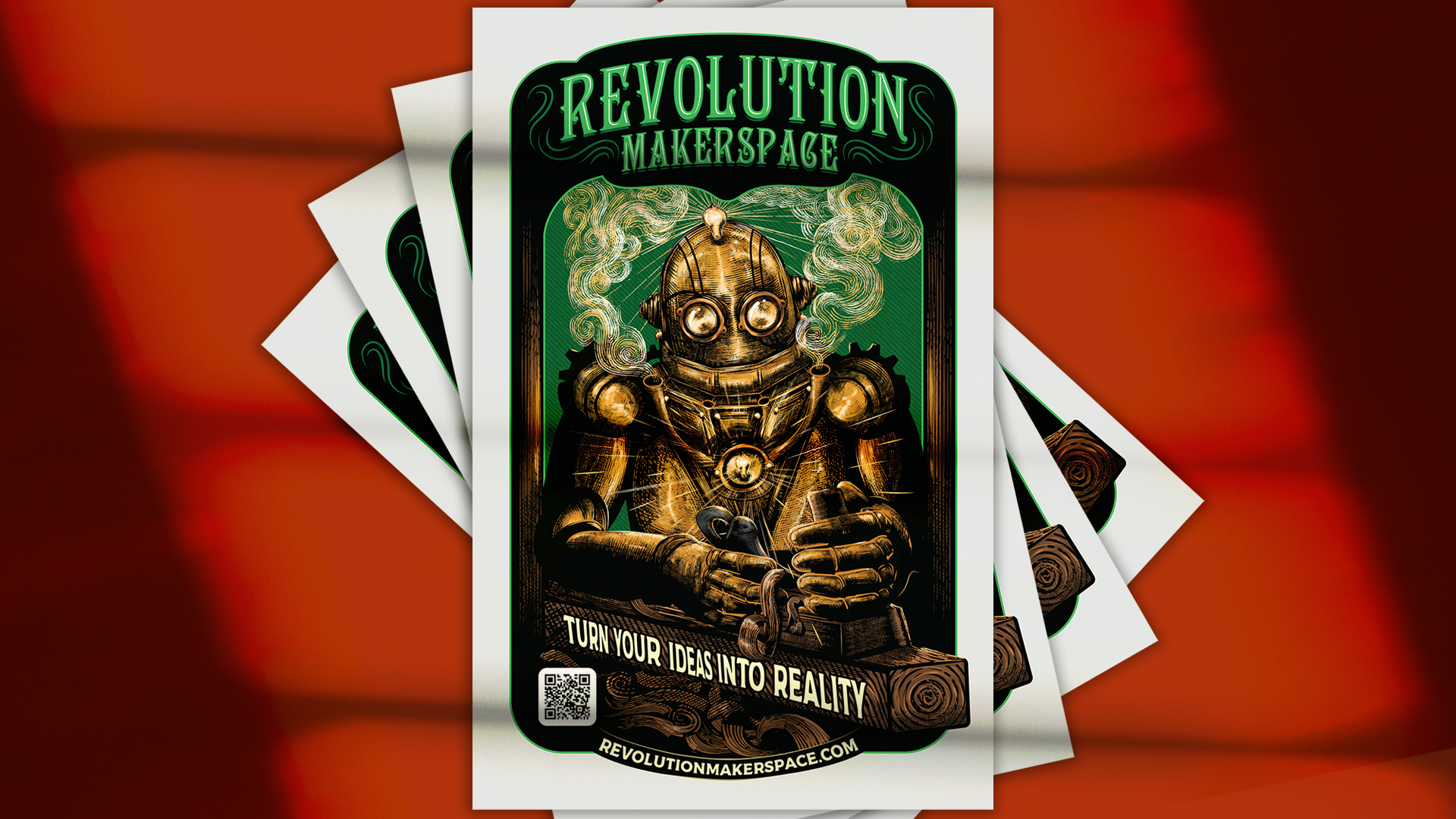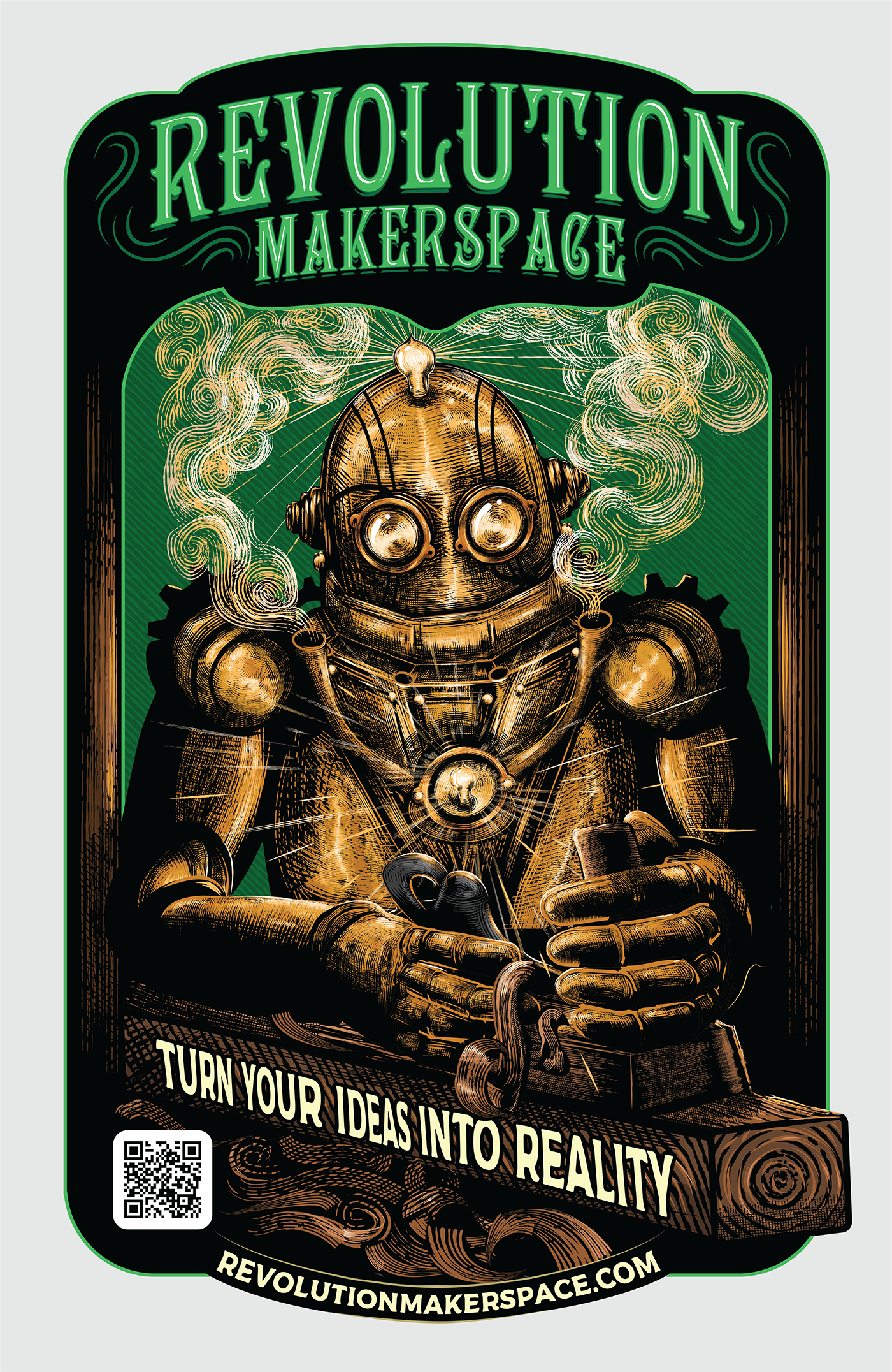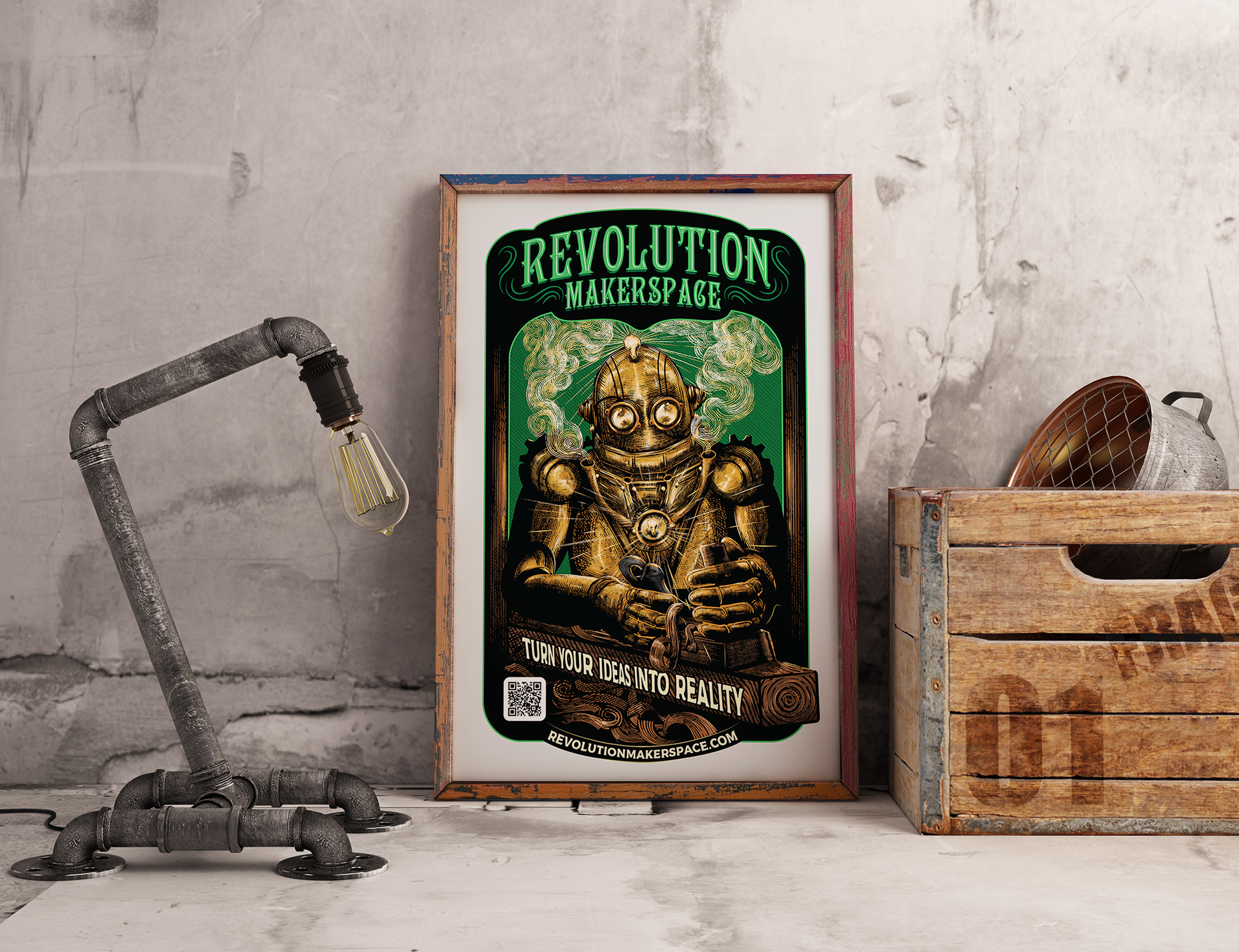 The main idea here was a steampunk themed poster design. I've made a robot character who works on a piece of lumber, using a wood plane. The lightning lightbulb on its head represents the idea, that fuel the robot to make something unique from wood.